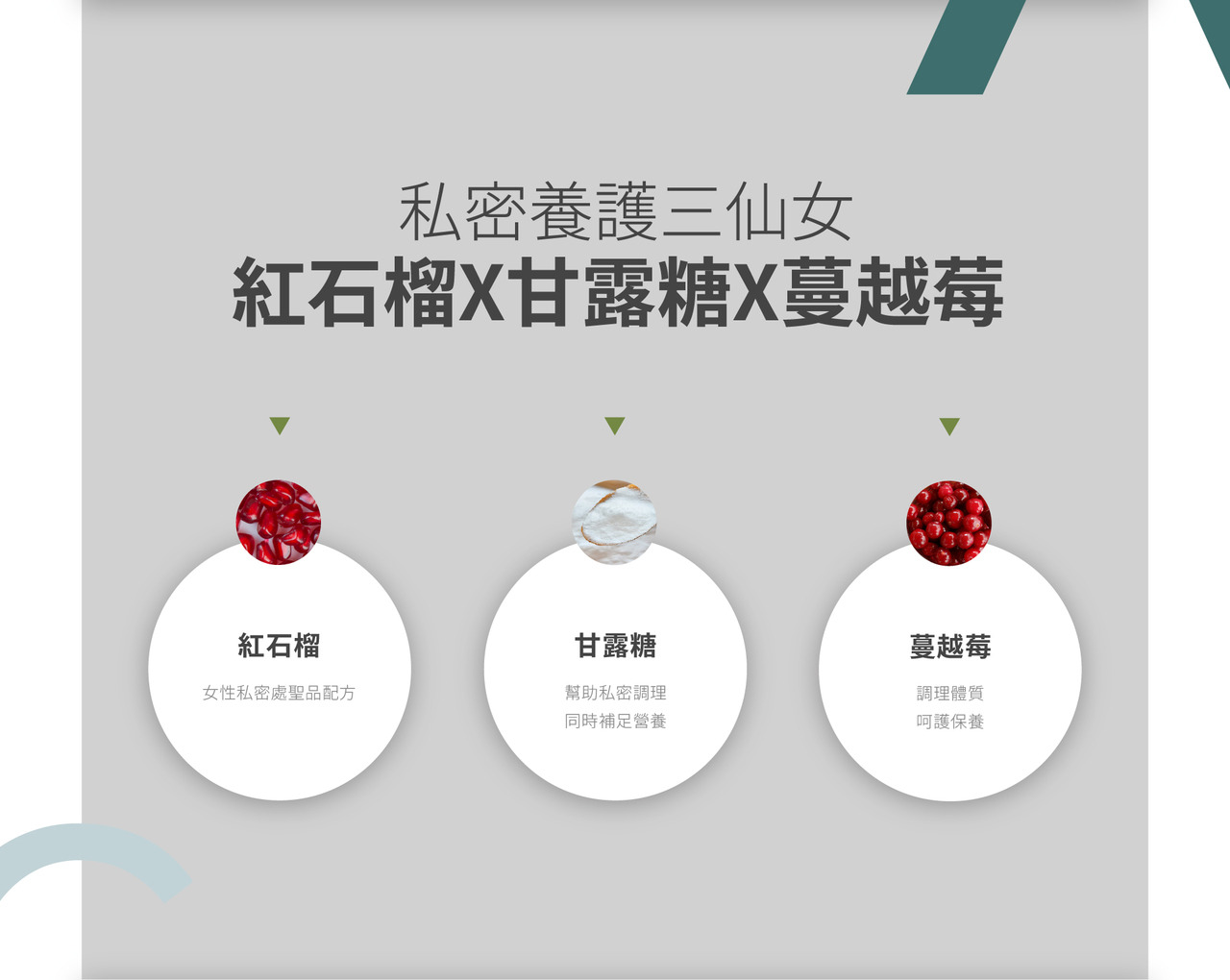植萃液(水、女貞子、土茯苓、玫瑰)、異麥芽寡糖、水、D-甘露糖、石榴濃縮汁、難消化性麥芽糊精、蔓越莓濃縮汁、蘋果濃縮汁、綜合莓濃縮汁(蘋果、蔓越莓、草莓、覆盆莓、櫻桃、黑醋栗、醋栗)、麥芽糊精、香料、維生素 C、蒟蒻粉、PomeTide® 石榴發酵液、花瓣發酵液(櫻花、山茶花、桂花、茉莉花)、洛神花萃取物、柿子萃取物、葡萄皮萃取物、蔓越莓萃取物。